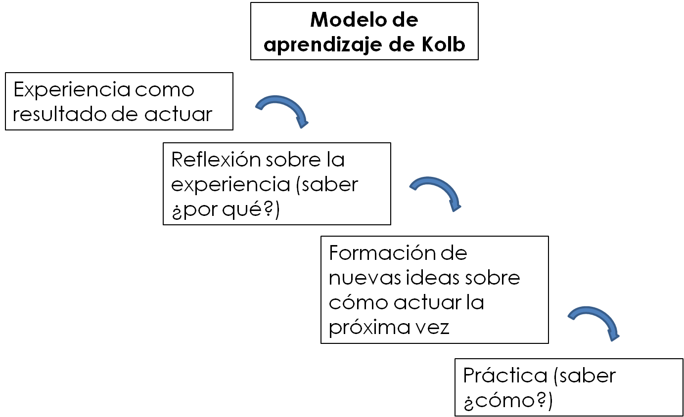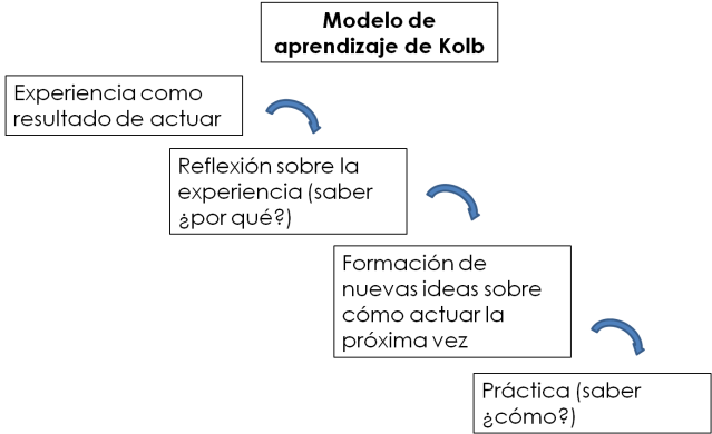 El modelo de aprendizaje de Kolb nos indica un procedimiento a seguir para aplicar la resiliencia, basado en la reflexión de la situación, la puesta en marcha de la creatividad y la acción. Quizás lo único que le cambiaría sería el «¿por qué?» del segundo paso, por un ¿PARA QUÉ?, que motiva a ir hacia el futuro en lugar de desgastarse en las causas de algo que es imposible de cambiar porque pertenece al pasado.